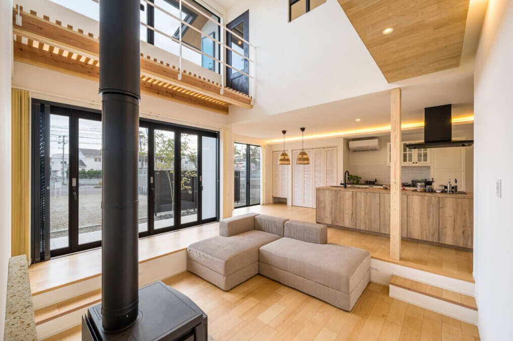 家の主要な構造材は、全て「南三陸杉」を採用。強度と美しさを兼ね備えた歴史ある地域材です。また、薪ストーブ周りには天然石である「秋保石」を採用。地産地消を実現しながら、薪ストーブを中心に家族が集う暮らしをデザインしました。