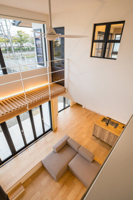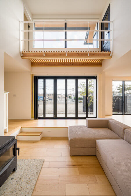 地元の花火大会を一望できる立地を生かし、家全体がつながるワンルームのようなプランを提案。自然光を取り入れるパッシブデザインにより、大きな窓から陽光が差し込む明るく開放的な住まいになりました。庭と一体化したソトとウチが連続する空間は、この街の四季やイベントを積極的に楽しむための工夫です。